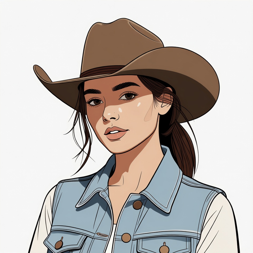 Illustration of a young woman with dark hair in a ponytail wearing a wide-brimmed brown cowboy hat. She has a subtle smile and wears a blue denim vest over a white top. The portrait is on an isolated white background.