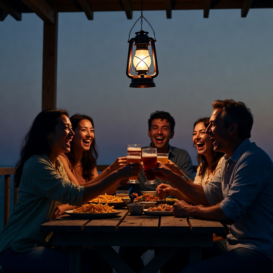 A diverse group of six adults, including Asian and White men and women, cheers with glasses of beer around a wooden table on a wooden patio at dusk. They laugh joyfully while surrounded by plates of french fries and other food. A hanging lantern illuminates the evening scene above the table.