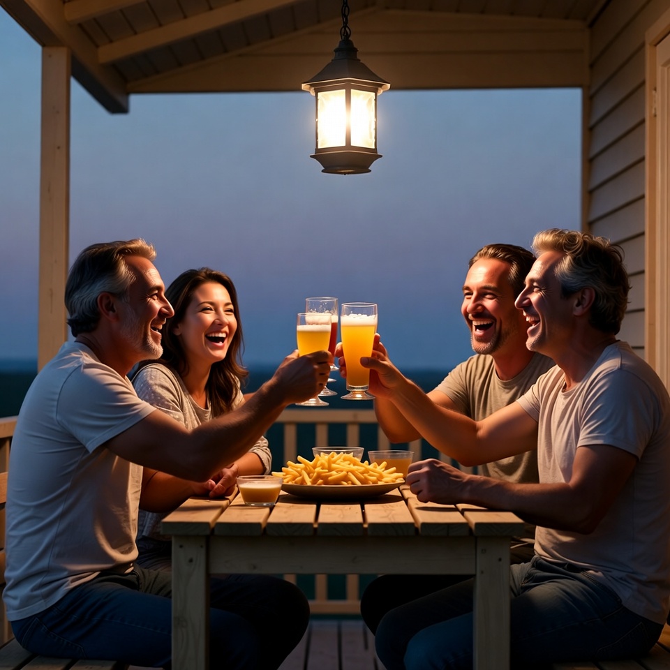 Four adults, three men and one woman, sit around a wooden table on a porch at dusk, clinking glasses of beer in a toast. A lit hanging lantern illuminates the scene above them, with a plate of french fries on the table. They wear casual t-shirts and jeans, smiling happily outdoors.