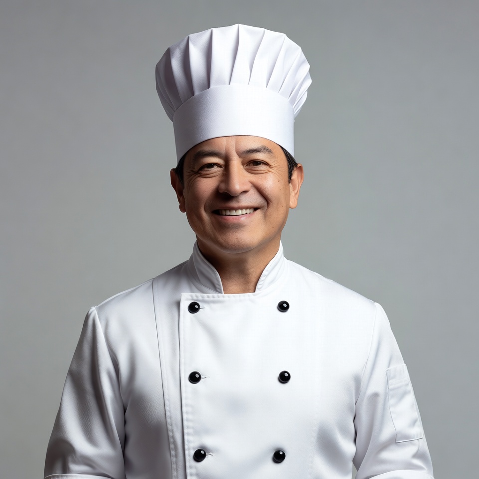 A middle-aged Asian man with short black hair smiles at the camera while wearing a tall white chef's toque and a double-breasted white chef's jacket with black buttons. He stands confidently against a plain gray background. His uniform is crisp and professional.