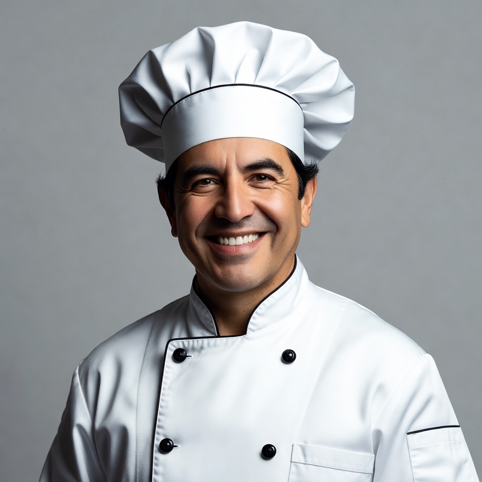 A Latino man with short dark hair smiles warmly at the camera while wearing a tall white chef's toque and a double-breasted white chef's jacket with black piping. He stands against a plain gray background. The uniform features decorative buttons and a clean, professional appearance.