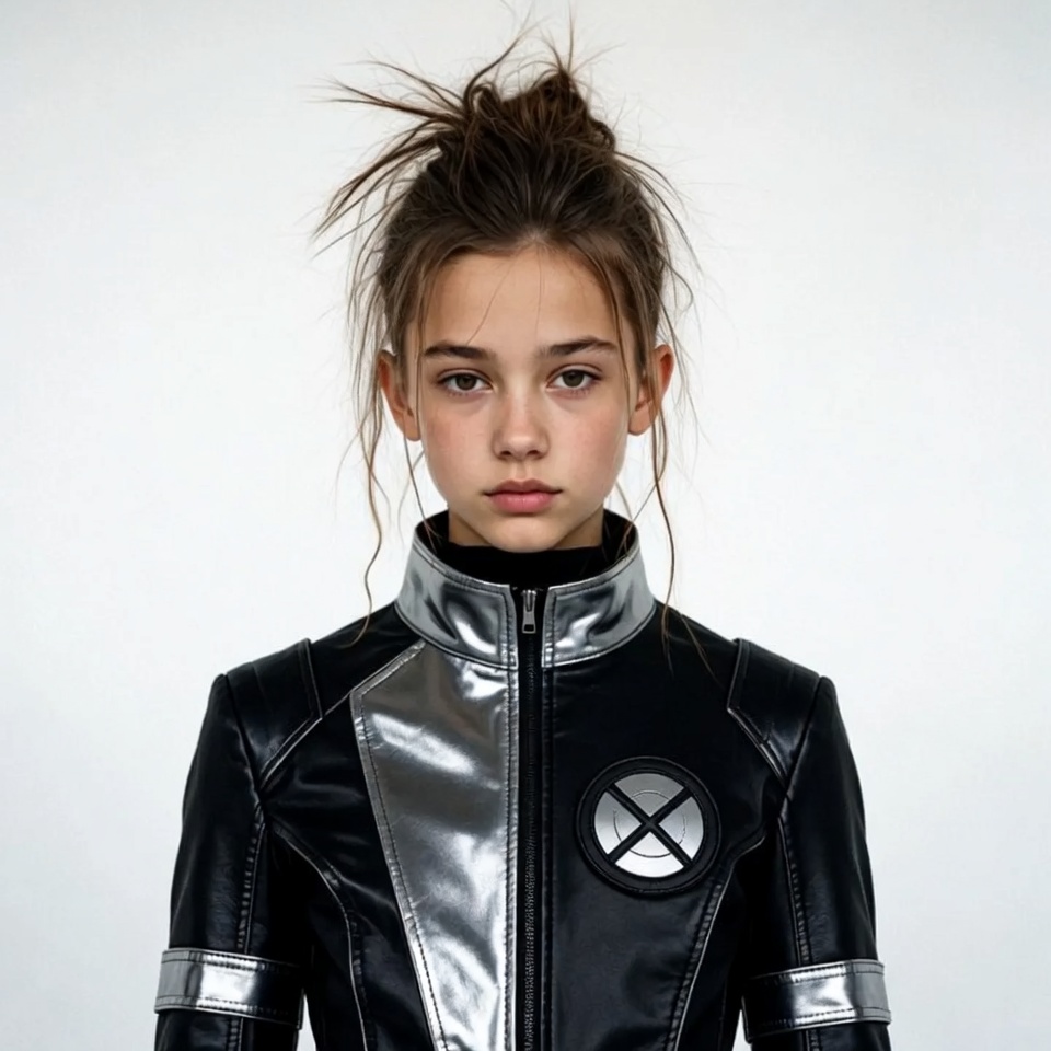 White, X-Men jacket, X-Men logo, black jacket, brown hair, bun hairstyle, cosplay, female, futuristic jacket, leather jacket, messy hair, neutral expression, portrait, pout face, shiny jacket, silver accents, standing pose, white background, young girl, girl