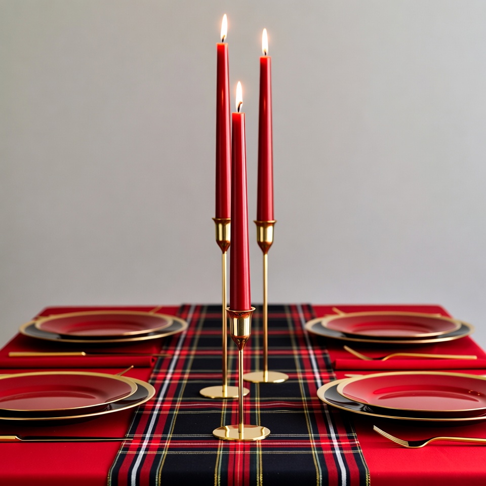 Three tall red candles burn brightly on a gold candelabra positioned in the center of a dining table. The table features a black and red plaid table runner with matching red and gold plates and gold utensils. The setup is viewed from above against a plain white background.