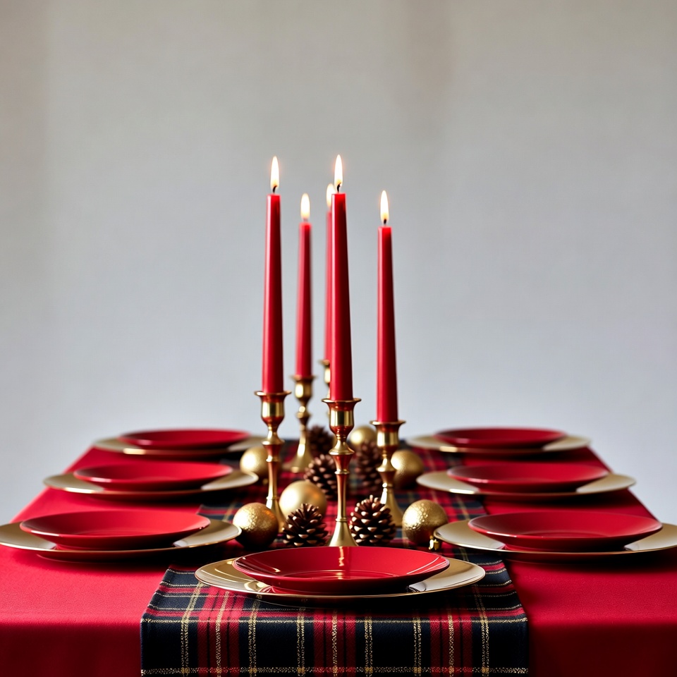 A elegant holiday table features tall red taper candles lit with flames on a gold candelabra. Red plates and gold pinecone ornaments are arranged on a plaid table runner over a red tablecloth. The setup is centered against a plain white background.