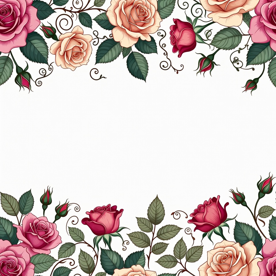 A symmetrical floral border illustration features clusters of pink and cream roses with green leaves and vines. Delicate buds and swirling tendrils frame a large white empty space in the center. The design is rendered in a detailed, artistic style on a plain white background.