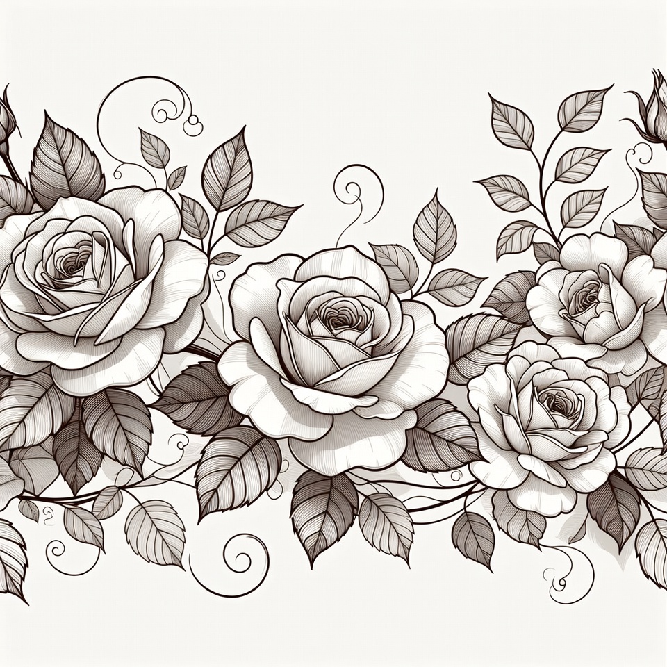 artistic border, blooming roses, decorative border, detailed roses, elegant flowers, engraving, floral border, floral design, floral elements, floral pattern, flower illustration, hand drawn, illustration, ink drawing, leaves, line art, monochrome roses, ornamental flowers, rose border, rose petals, rose stems, rose vine, roses bouquet, seamless border, sketch roses, vector roses, vines, white background, white roses, roses