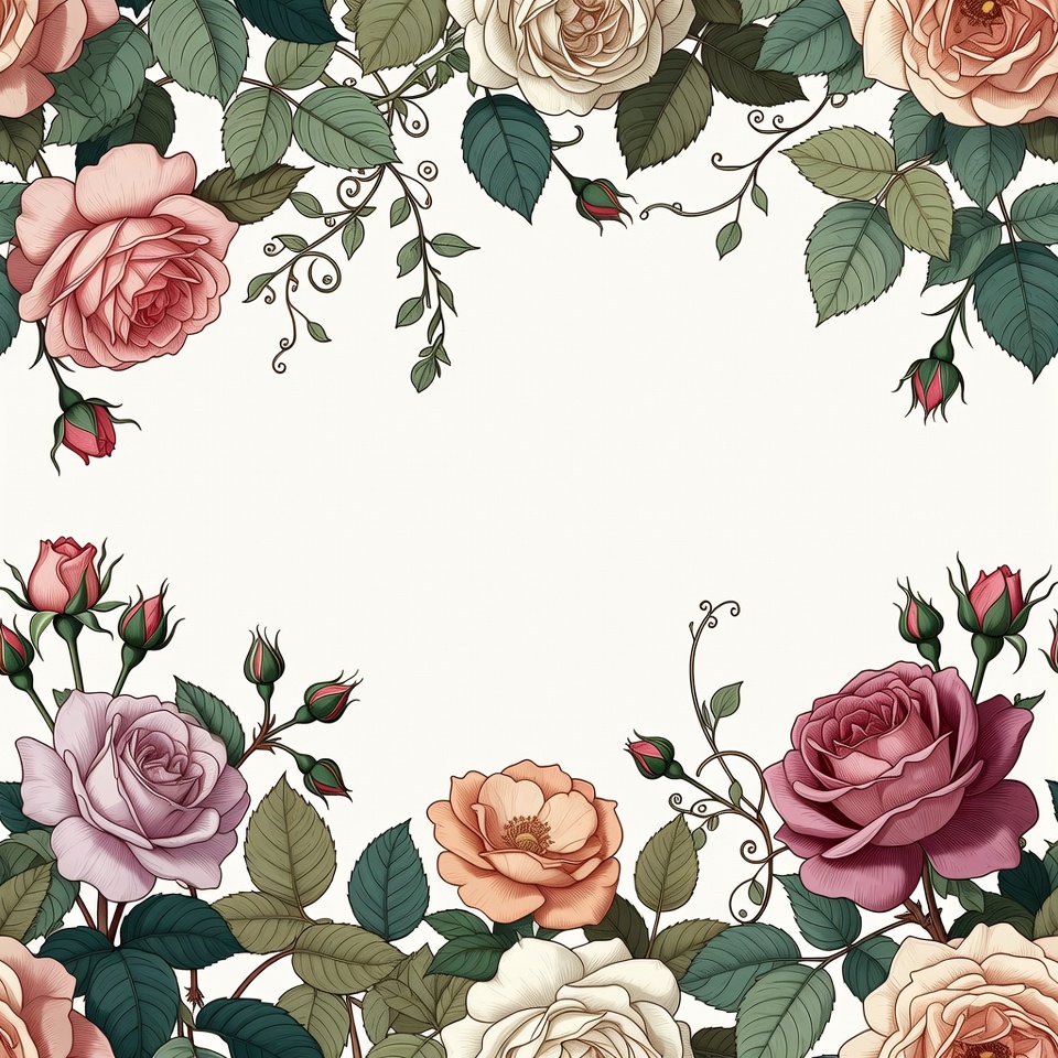 A detailed watercolor-style illustration features an assortment of pink, white, peach, and orange roses arranged in a symmetrical border frame. Lush green leaves and curving vines extend from the flowers, framing a central white space. The design showcases intricate petal textures and natural botanical elements on an isolated white background.