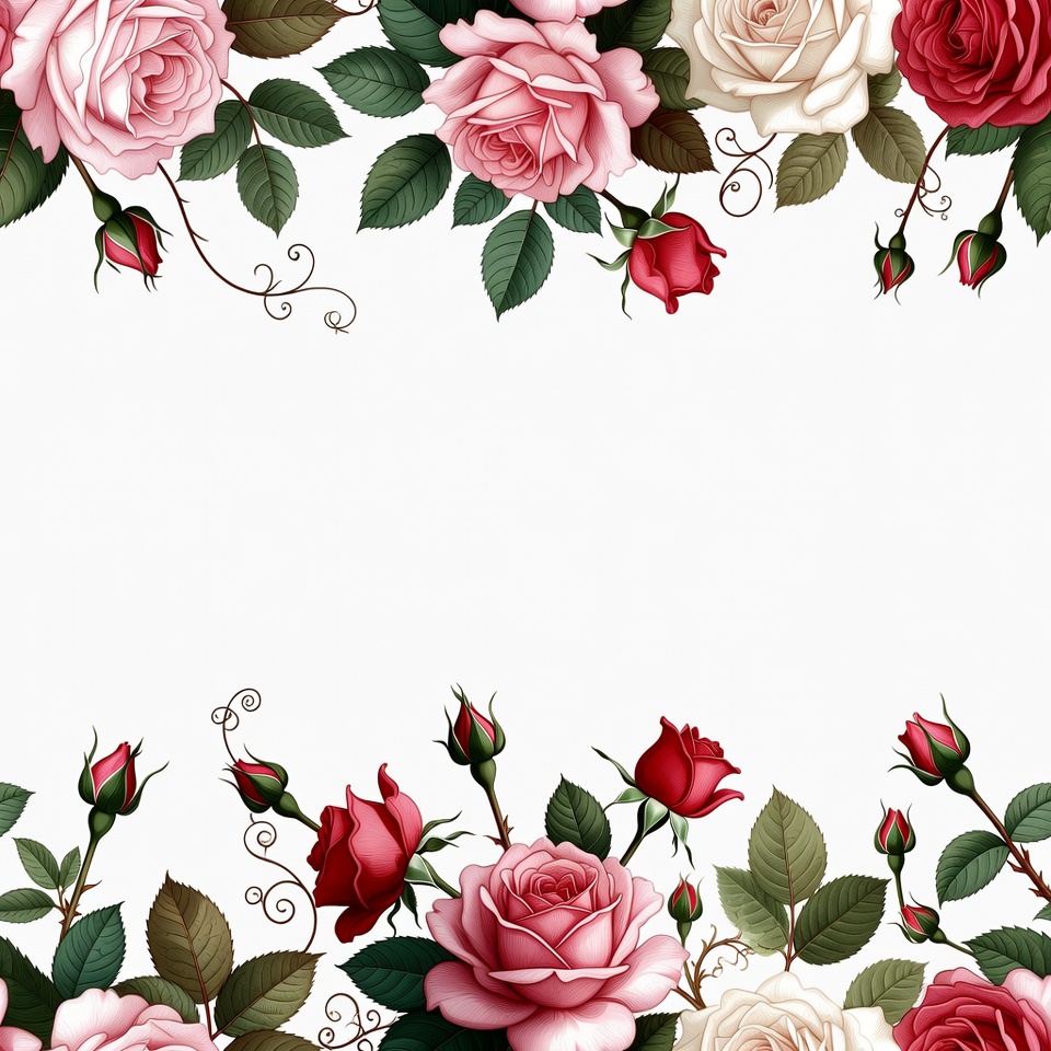 A vibrant floral border illustration features clusters of roses in pink, white, and red hues with green leaves and stems. Delicate buds and curly vines frame a large blank white space in the center. The design is symmetrical and isolated on a white background.