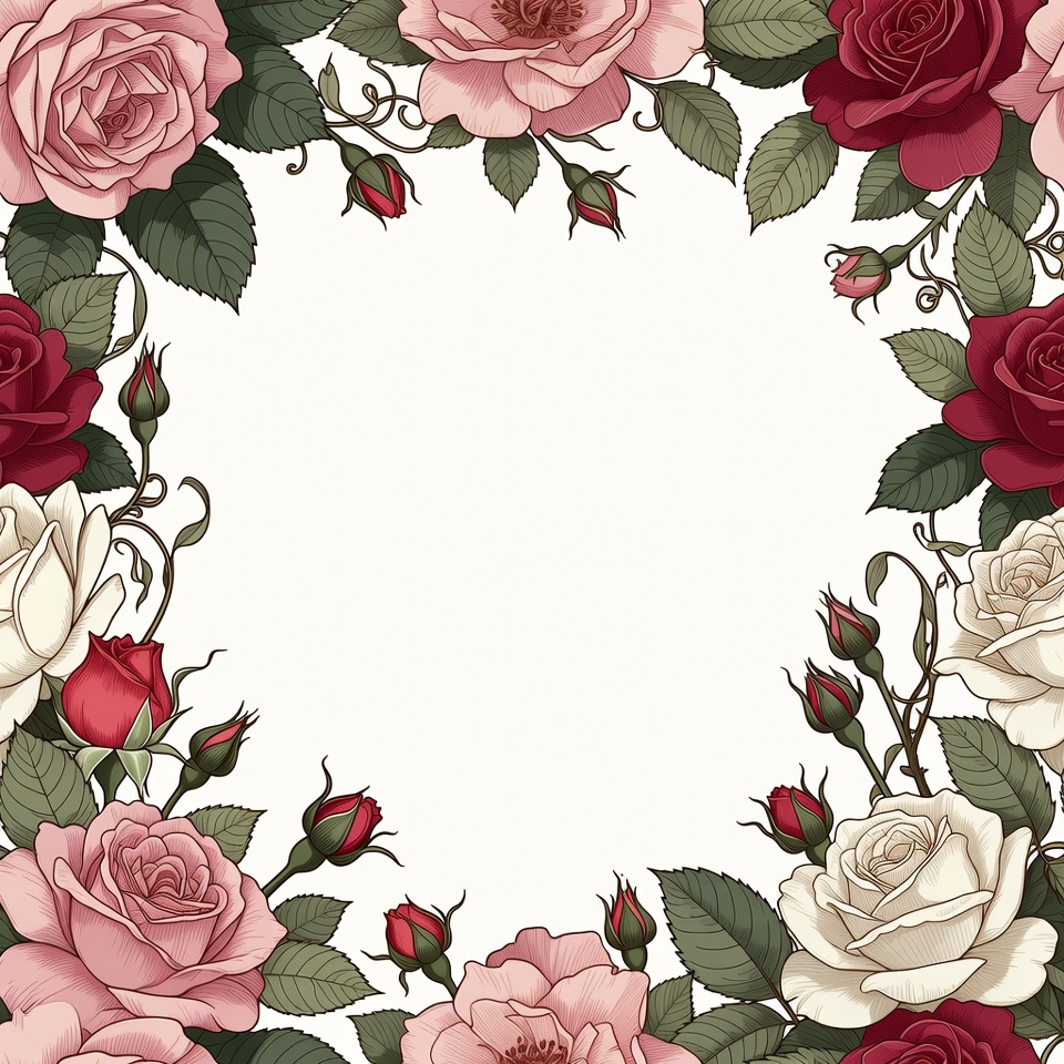 A detailed watercolor-style illustration features clusters of pink, red, and white roses arranged in a circular border. Green leaves and stems with rosebuds frame a large empty white space in the center. The design is symmetrical and ornate, perfect for invitations or decorations.