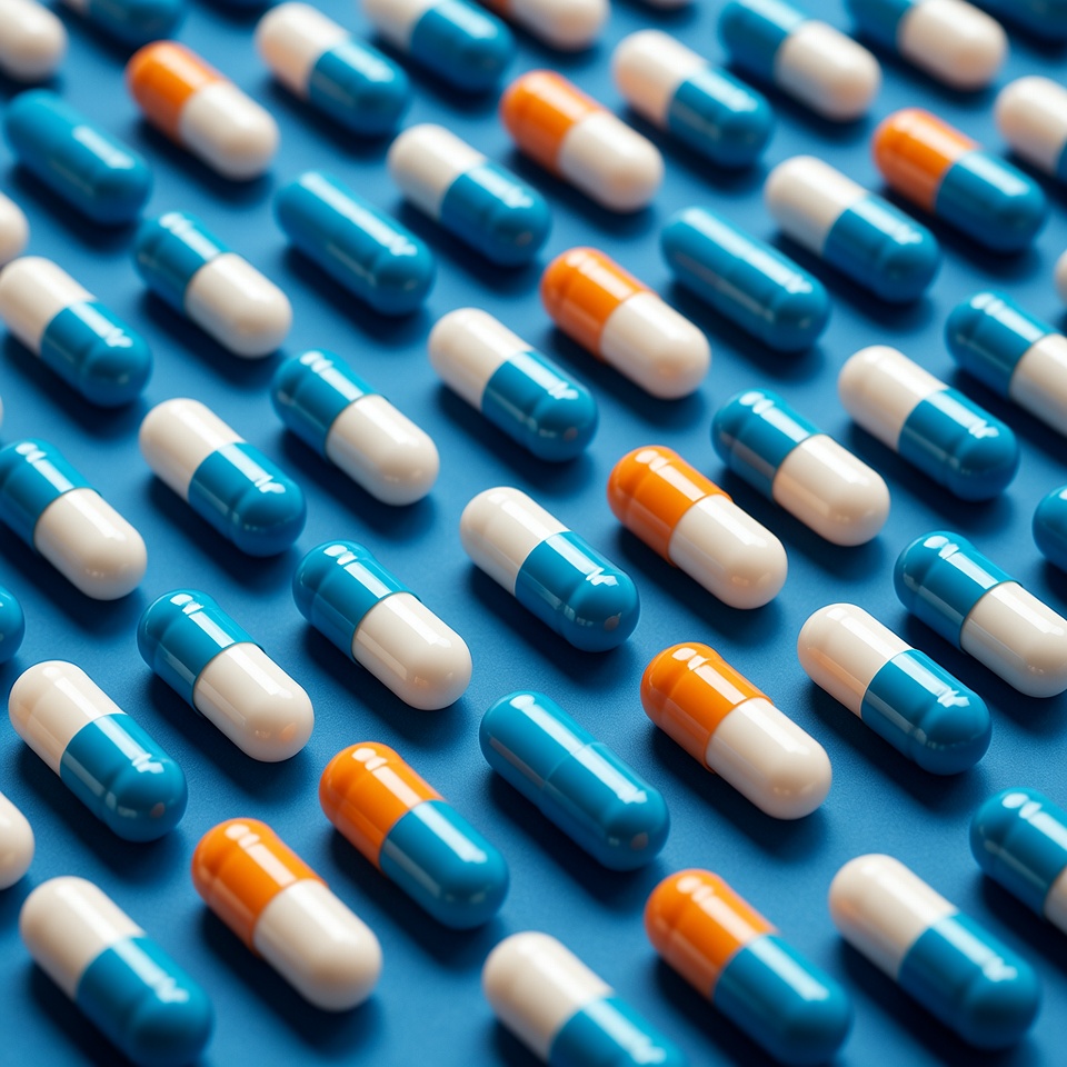 A flat lay of numerous prescription pills arranged in a dense grid pattern on a solid blue background. The pills are primarily capsule-shaped, featuring white bodies with blue or orange caps. The composition creates a textured, repetitive pharmaceutical design.