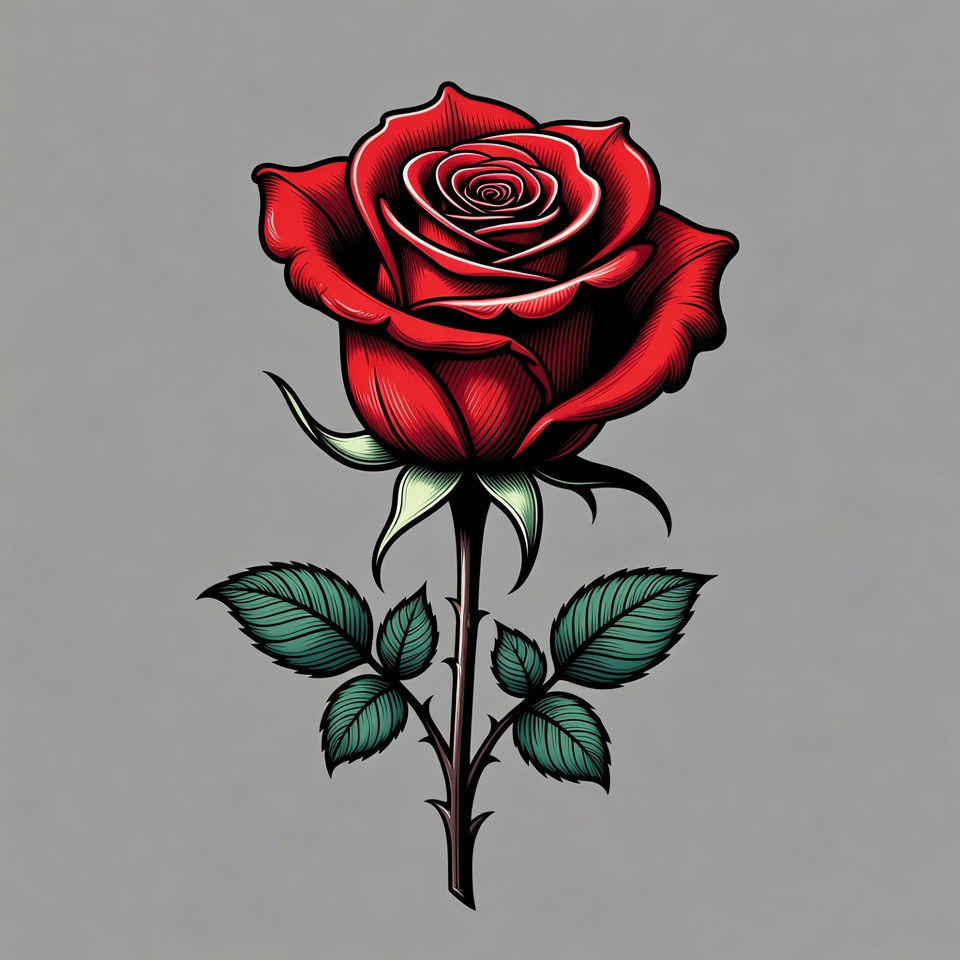 artistic rose, clipart, floral design, flower, gray background, green leaves, illustration, isolated background, petals, rose, stem, tattoo style, thorns, vector art, red rose
