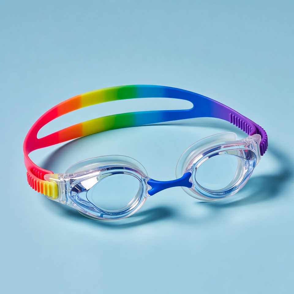 blue background, clear lenses, goggles, isolated background, kids goggles, pool goggles, purple trim, rainbow goggles, rainbow strap, sports equipment, swim goggles, swimming, water sports, swimming goggles