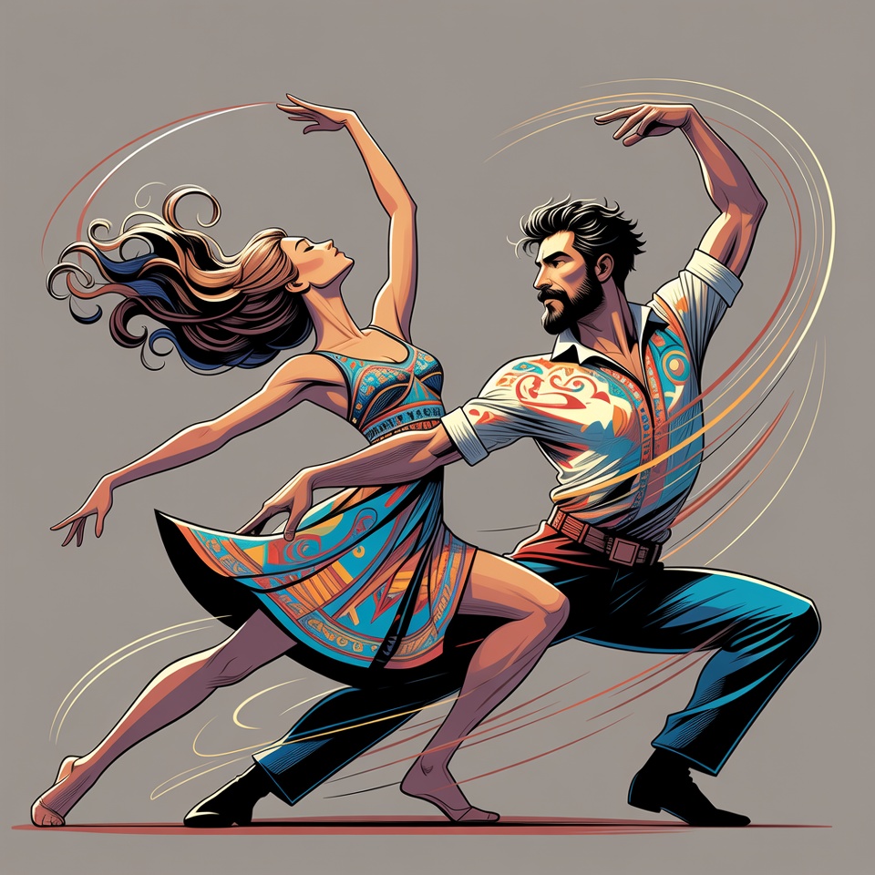 A man and woman perform a dynamic dance pose in a vibrant illustration. The woman with long wavy hair wears a colorful short dress and extends her arms gracefully while leaning back. The bearded man in patterned shirt and pants supports her with one arm extended and the other on his hip.