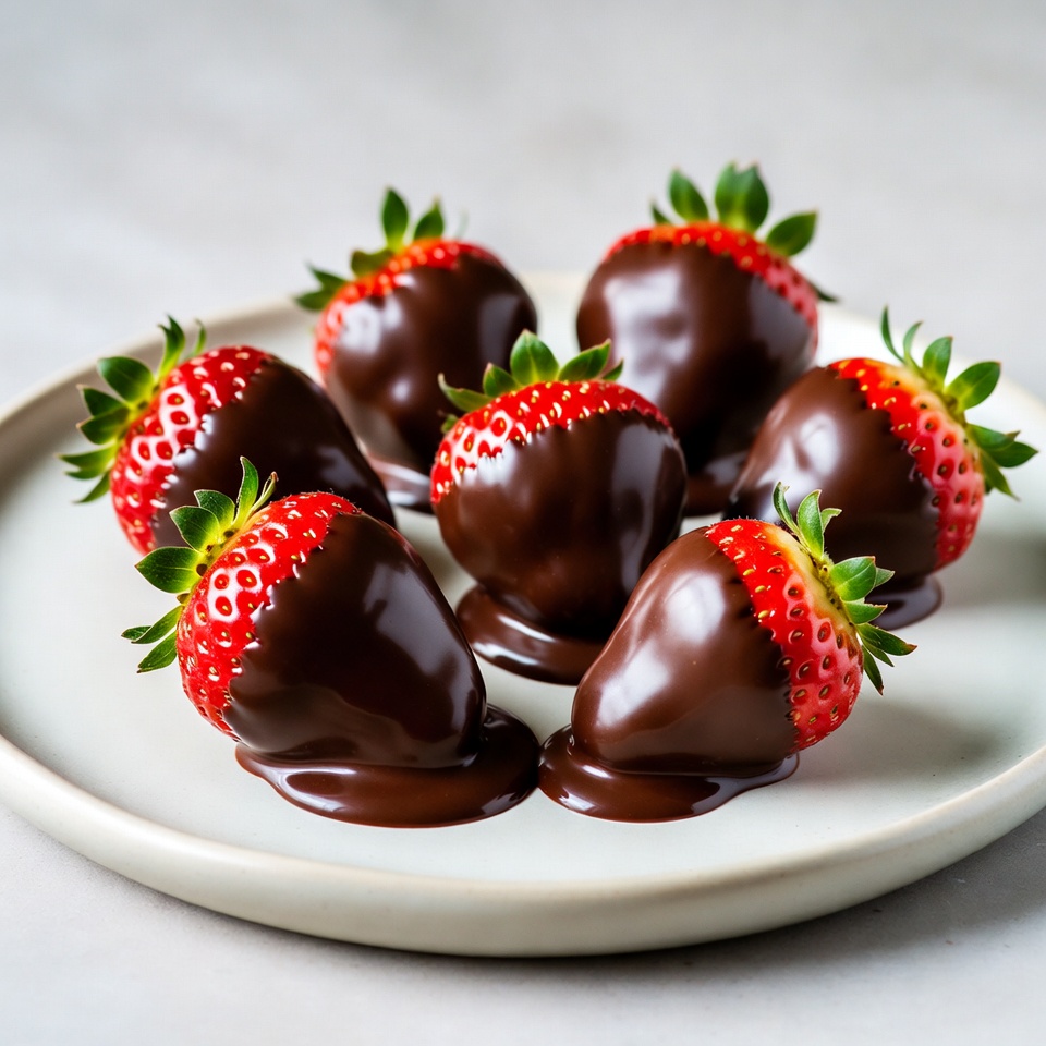 Six fresh strawberries dipped in thick melted chocolate are arranged in a circle on a white plate. The red tops of the strawberries peek out above the glossy chocolate coating. Some chocolate drips slightly onto the plate.
