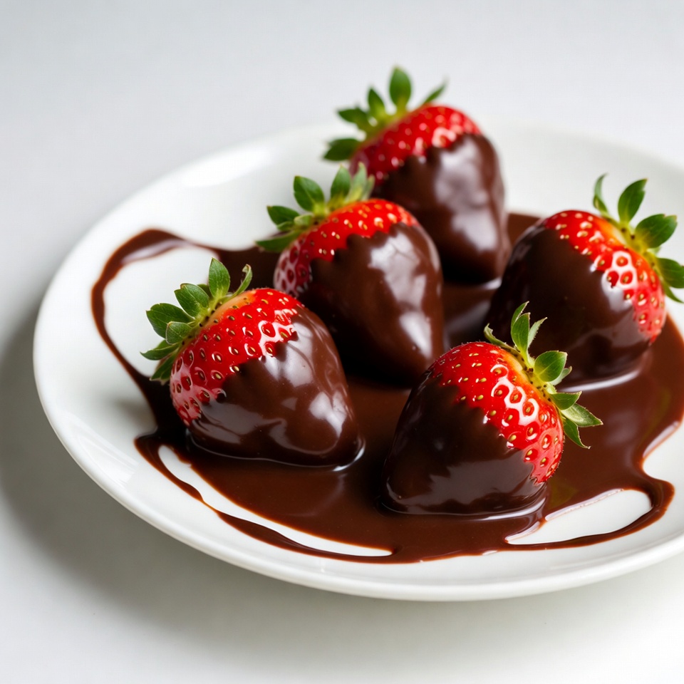 Fresh strawberries dipped in thick melted chocolate sit on a white plate. Chocolate sauce pools around the berries, with some drizzling off the edges. The strawberries retain their green leaves and red tips visible through the coating.
