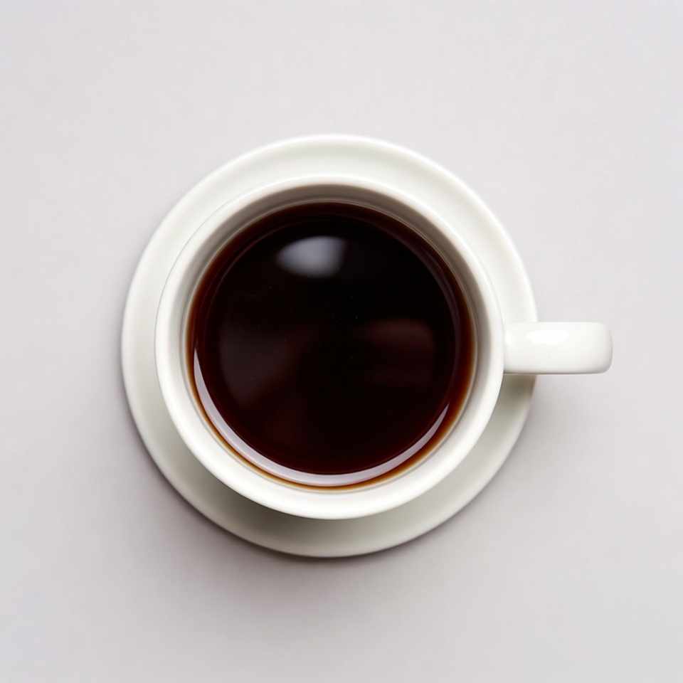 A white porcelain coffee cup filled with dark steaming coffee sits on a matching saucer. The overhead view highlights the glossy dark liquid surface with subtle steam wisps. The setup is centered on a plain light gray background.