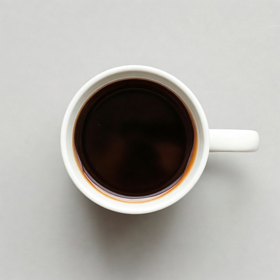 A white ceramic mug filled with dark steaming coffee is viewed from directly above. The coffee has a smooth surface with subtle steam rising and a thin rim of lighter liquid near the edges. It sits on a plain gray background.