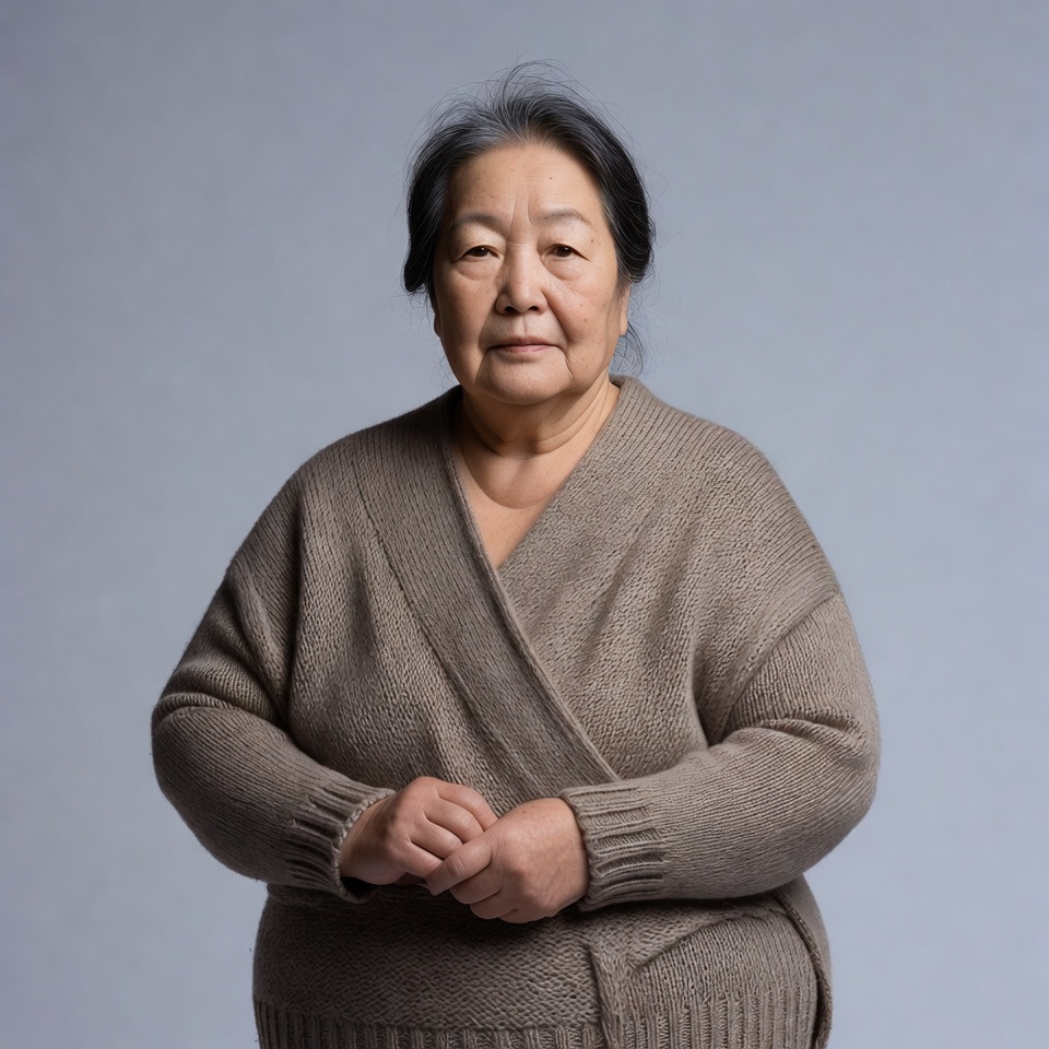 An elderly Asian woman with graying black hair stands against a plain gray background. She wears a loose-fitting beige knit sweater with a wrap-style front and holds her hands clasped in front. Her expression is calm and direct toward the camera.