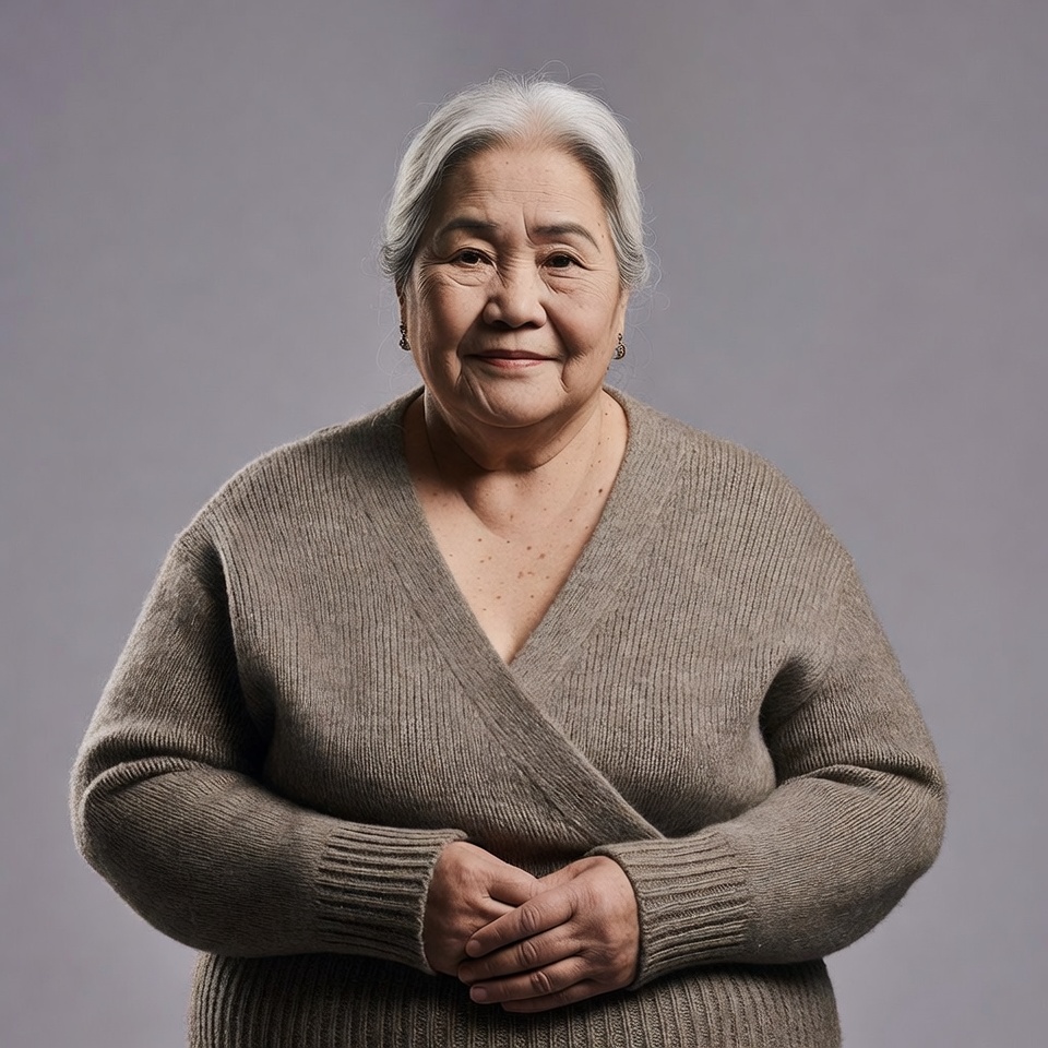 An elderly Asian woman with silver hair smiles warmly at the camera. She wears a loose-fitting beige knit sweater with a V-neck and has hands clasped in front. She stands against a plain gray background.