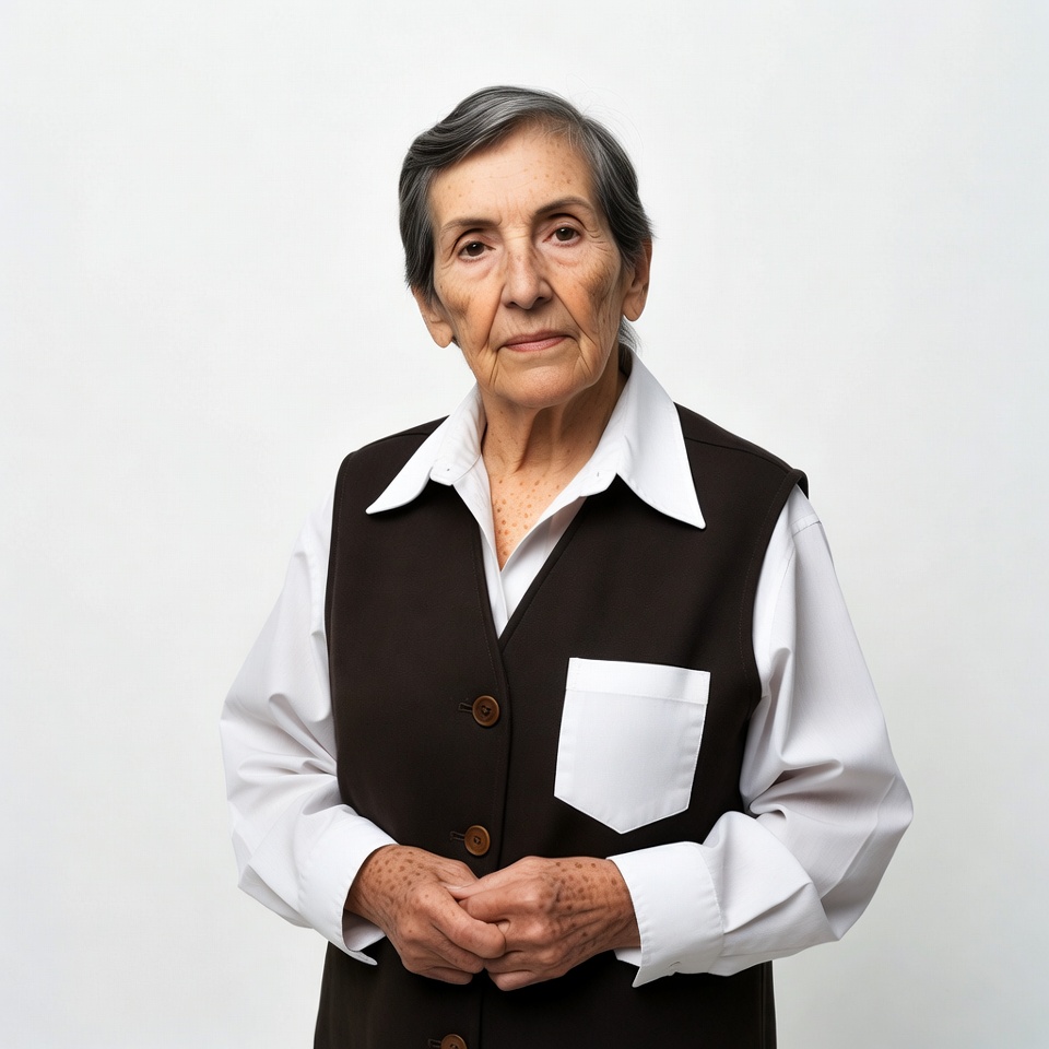 An elderly woman with short gray hair stands against a white background. She wears a white collared shirt under a brown vest with buttons and a pocket. Her hands are clasped in front of her as she looks directly at the camera.