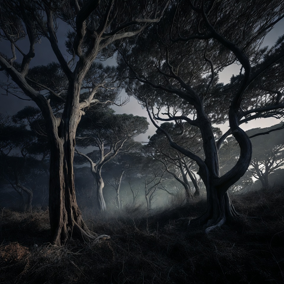 Misty Dark Twisted Pine Forest
