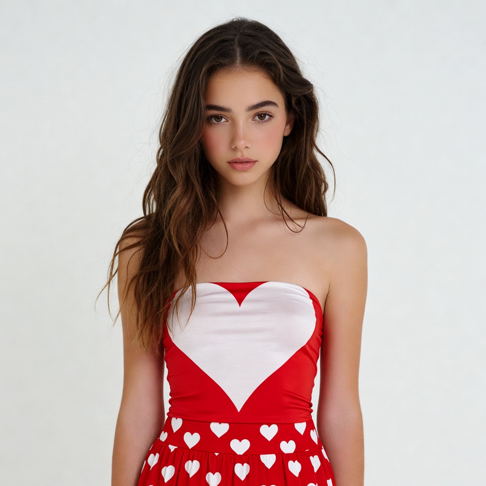 A young girl with long wavy brown hair stands against a white background wearing a strapless red dress. The dress features a large white heart-shaped top and a skirt covered in white heart patterns. She poses confidently with her hands at her sides.