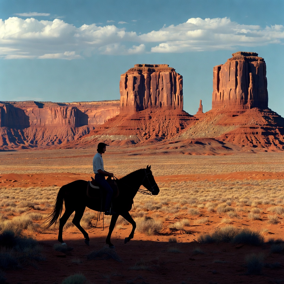 Monument Valley, White, adventure, brown horse, buttes, cloudy sky, desert, equestrian, golden hour, hat, horse, man, outdoor, red rocks, riding, saddle, sandstone formations, shadows, sparse grass, traveler, vast landscape, western, white shirt, cowboy