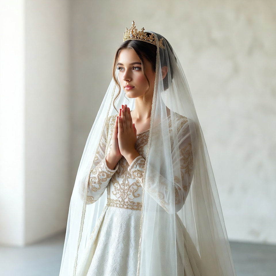 A young woman in an elaborate white wedding gown with gold embroidery and a golden crown stands in a white room. She has her hands clasped together in prayer, wearing a long white veil draped over her head. Her expression is serene as she gazes slightly downward.