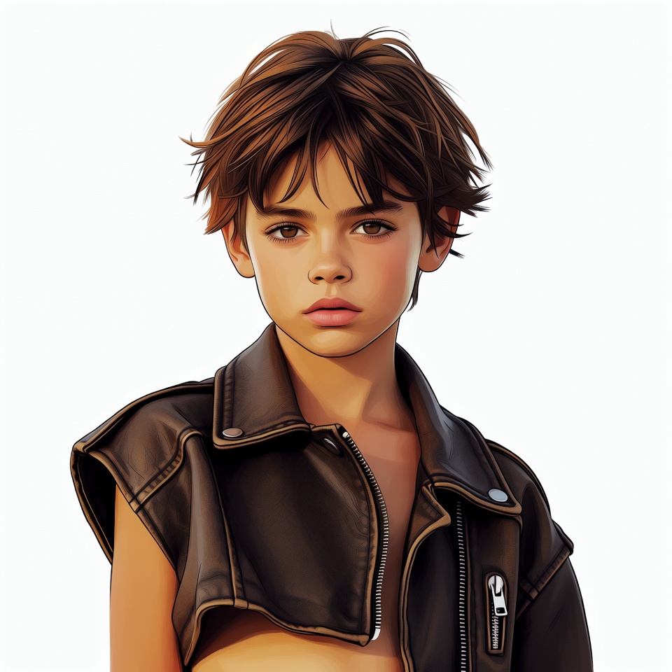 A digital illustration of a young person with short tousled brown hair and large expressive eyes faces forward against a white background. They wear an open brown leather jacket with prominent zipper, exposing bare shoulders and chest. The style features smooth shading and realistic details typical of AI-generated art.