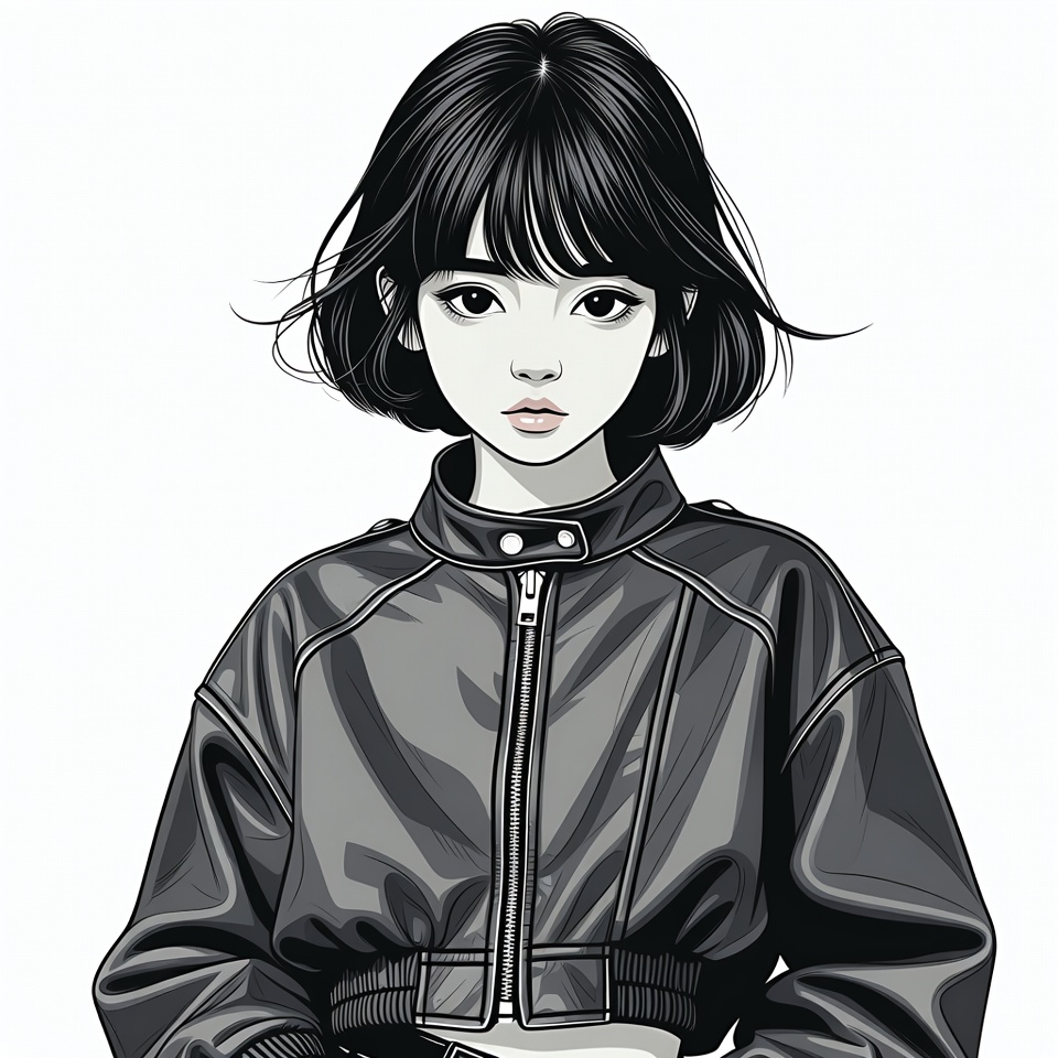 Asian, bangs, black hair, black jacket, bob haircut, character design, cute girl, drawing, expressive eyes, fashion, female, illustration, isolated background, leather jacket, line art, manga style, portrait, stylish, white background, young woman, zipper jacket, anime girl