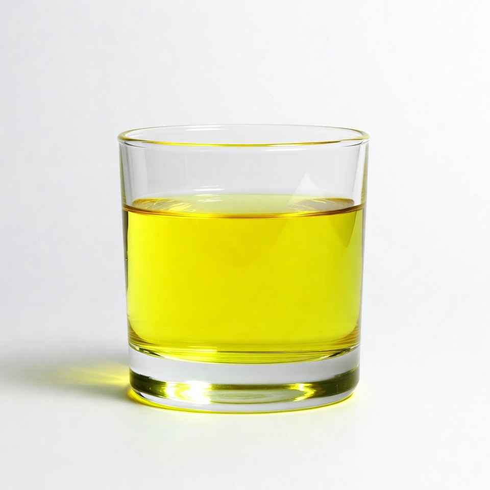 A clear glass tumbler filled with yellow liquid sits on a white background. The liquid is transparent and fills the glass about halfway. The glass has a simple cylindrical shape with a smooth rim.