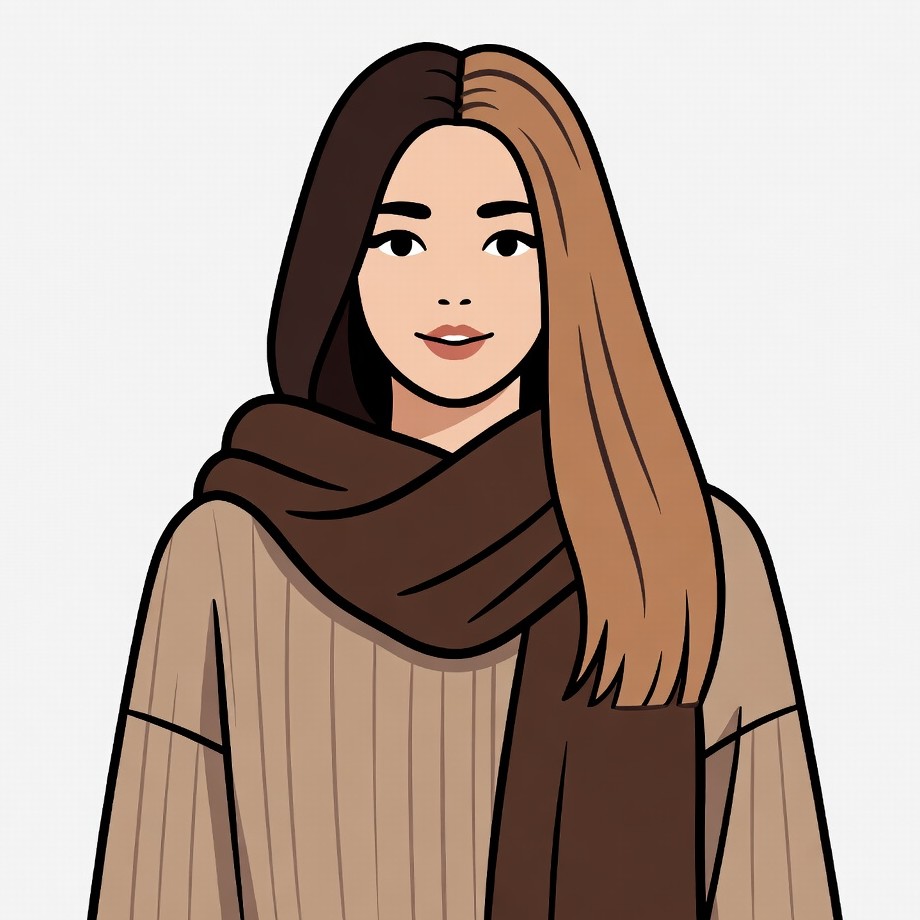 An illustration of an Asian woman with long hair split into dark brown on one side and blonde on the other. She wears a beige knit sweater and a brown scarf draped around her neck. The image features a simple isolated white background.