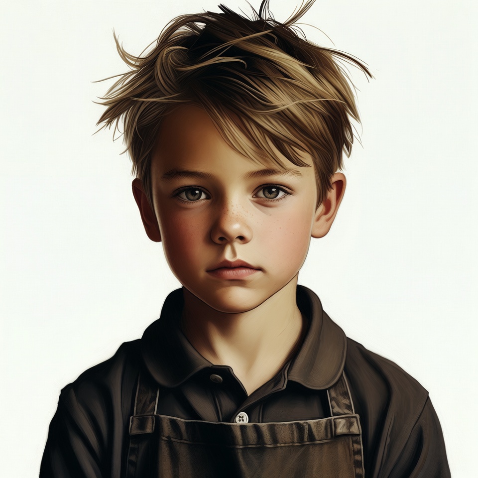 A young boy with tousled blonde hair and green eyes stares directly at the viewer. He wears a brown collared shirt with a matching apron tied around his neck. The portrait is rendered in a realistic digital illustration style against a plain white background.
