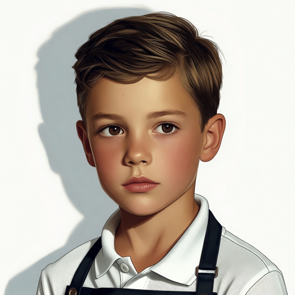 A young boy with short brown hair and flushed cheeks stands against a white background in a digital illustration. He wears a white collared shirt with denim overall straps over the shoulders. A subtle shadow falls behind him, adding depth to the portrait.
