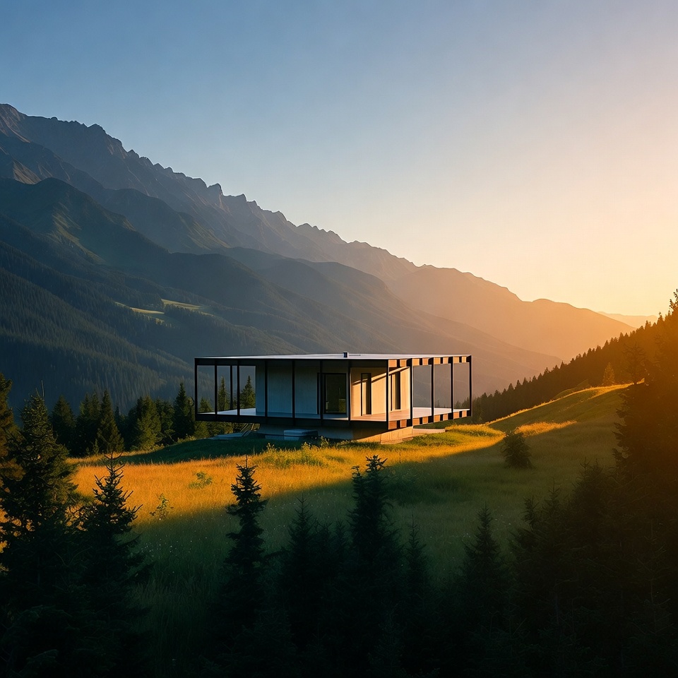 A sleek modern house with glass walls and steel frame sits on a grassy slope surrounded by pine trees. Snow-capped mountains rise dramatically in the background under a clear blue sky. Golden sunlight illuminates the scene during sunset.