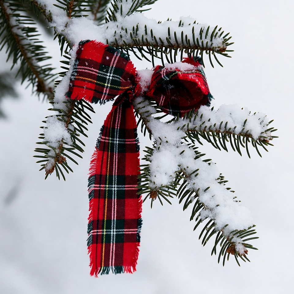 Christmas bow, Christmas decoration, bow tie, evergreen branch, festive ribbon, fir needles, fir tree, forest branch, green needles, holiday bow, holiday decor, nature winter, plaid bow, plaid fabric, red plaid, red ribbon, snow branch, snow covered, snowy pine, snowy tree, tartan pattern, tree ornament, white snow, winter scene, pine branch