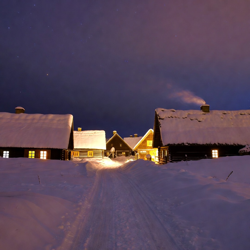 Nordic cabins, cabin cluster, chimney smoke, chimneys smoking, frosty night, frozen village, glowing windows, illuminated houses, log cabins, night sky, purple sky, rural winter, snow path, snow scene, snow-covered roofs, snowy village, starry sky, stars, warm lights, windows glowing, winter landscape, winter night, wooden architecture, wooden houses, snowy cabins
