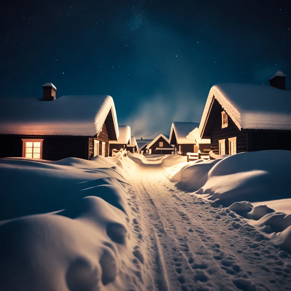 Nordic cabins, cabins in snow, cozy cabins, dark blue sky, frozen path, illuminated windows, night sky, northern lights, rural winter, snow covered roofs, snow path, snowdrifts, snowy landscape, starlit night, starry sky, warm lights, winter night, winter village, wooden houses, snowy cabins