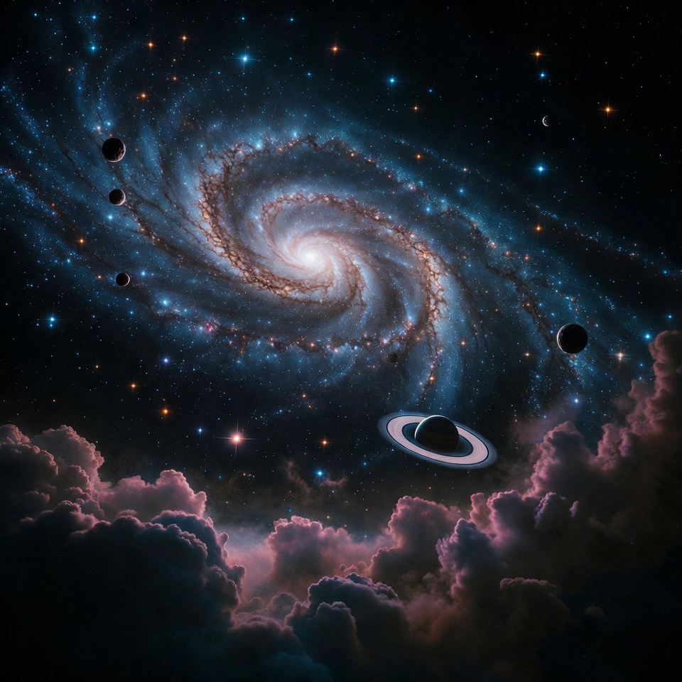 Spiral Galaxy with Planets and Saturn
