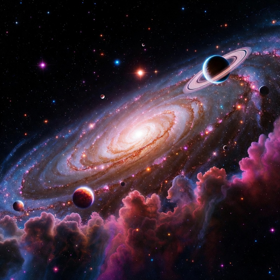 A stunning spiral galaxy with glowing arms twists through a cosmic scene filled with colorful stars and nebulae. Saturn with its prominent rings and a red planet are visible nearby, surrounded by scattered planets and pinkish cosmic clouds. The image captures a vibrant, star-filled universe on a black space background.