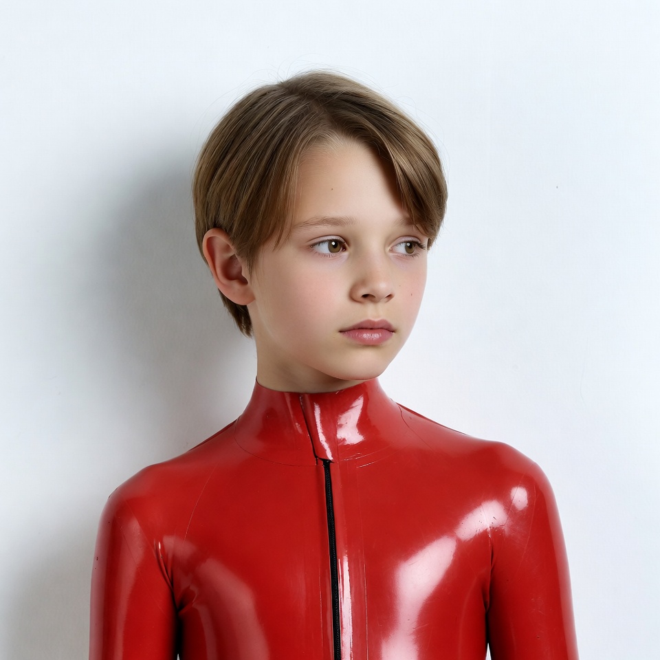 White, bodysuit, brown hair, child, form-fitting, full body, glossy material, latex catsuit, male, portrait, red latex, shiny latex, short hair, studio photo, white background, young boy, zipper, boy