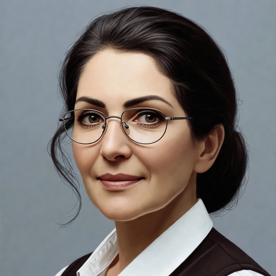 A woman with dark hair in a bun smiles at the viewer while wearing round metal-framed glasses. She has a white collared shirt under a brown vest. The portrait is set against a plain gray background.