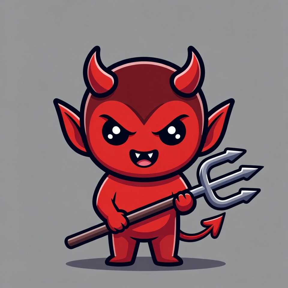 A kawaii-style cartoon devil with red skin, large black horns, pointed ears, and angry eyes smiles while holding a black trident. It stands on a plain gray background with simple shadows. The illustration features bold outlines and vibrant colors.