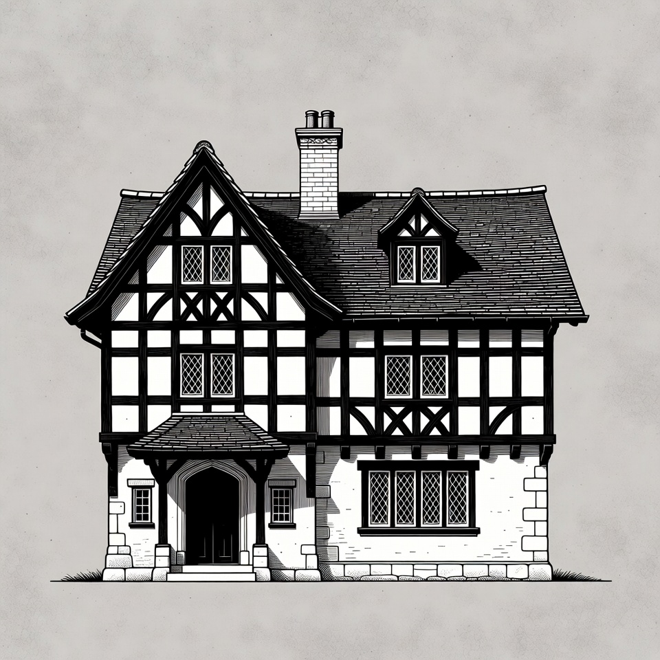 A detailed black and white ink illustration of a classic Tudor-style house with timber framing and white plaster walls. The two-story building features a steep gabled roof, multiple leaded glass windows, a brick chimney, and a covered front entrance. It stands isolated on a light gray background.