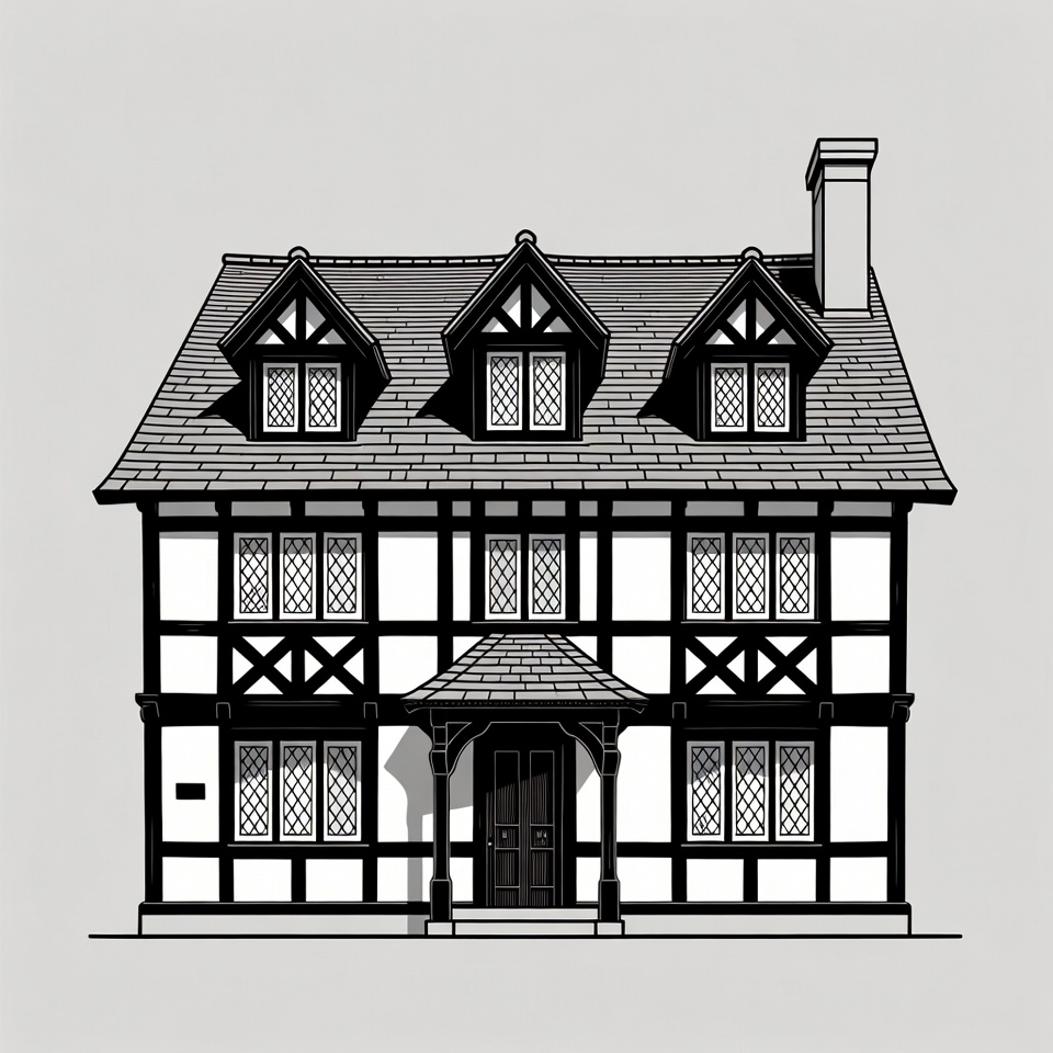 English house, architecture, black and white, chimney, clipart, front door, gabled roof, half-timbered house, house drawing, illustration, isolated background, line drawing, medieval house, porch, traditional house, vector art, windows, Tudor house