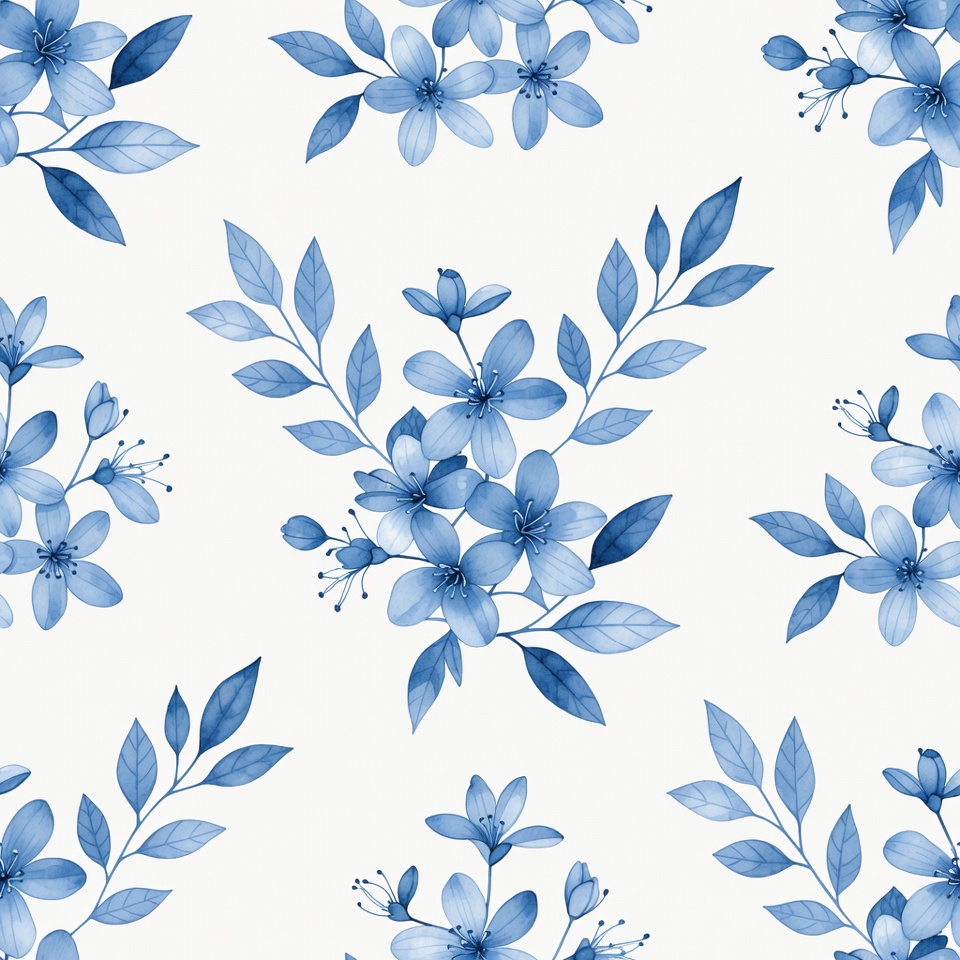 A seamless pattern features clusters of delicate blue watercolor flowers with green leaves on a white background. The flowers have multiple petals and fine details, repeating in a symmetrical floral design. The illustration style gives a soft, artistic appearance ideal for backgrounds or textiles.