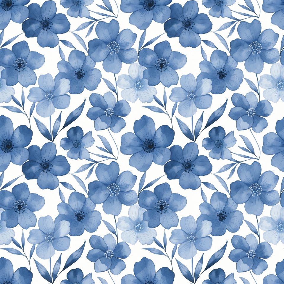 A seamless pattern features numerous blue watercolor-style flowers with green leaves on a white background. The flowers have layered petals and delicate stems, arranged in a repeating design. The artwork creates a continuous, tileable floral motif in shades of navy and light blue.