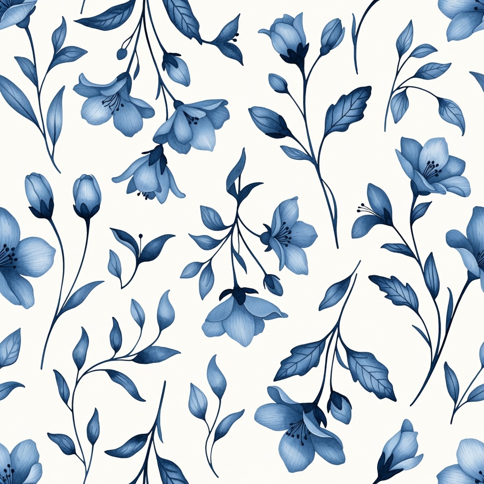 artistic flowers, blue blossoms, blue petals, botanical illustration, clipart, decorative flowers, digital art, elegant pattern, floral design, floral pattern, floral seamless, flower art, flower bouquet, flower buds, flower clusters, green leaves, illustration, leaf veins, leaves, nature illustration, navy flowers, pattern background, repeating pattern, seamless pattern, stems, vector flowers, watercolor flowers, white background, blue flowers