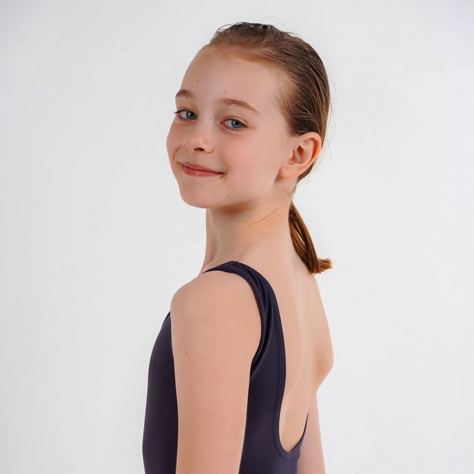 A young girl with light brown hair in a ponytail stands in three-quarter profile view against a white background. She wears a sleeveless purple leotard that reveals her back and smiles slightly while looking over her shoulder. Her skin is fair and she has a slender build.