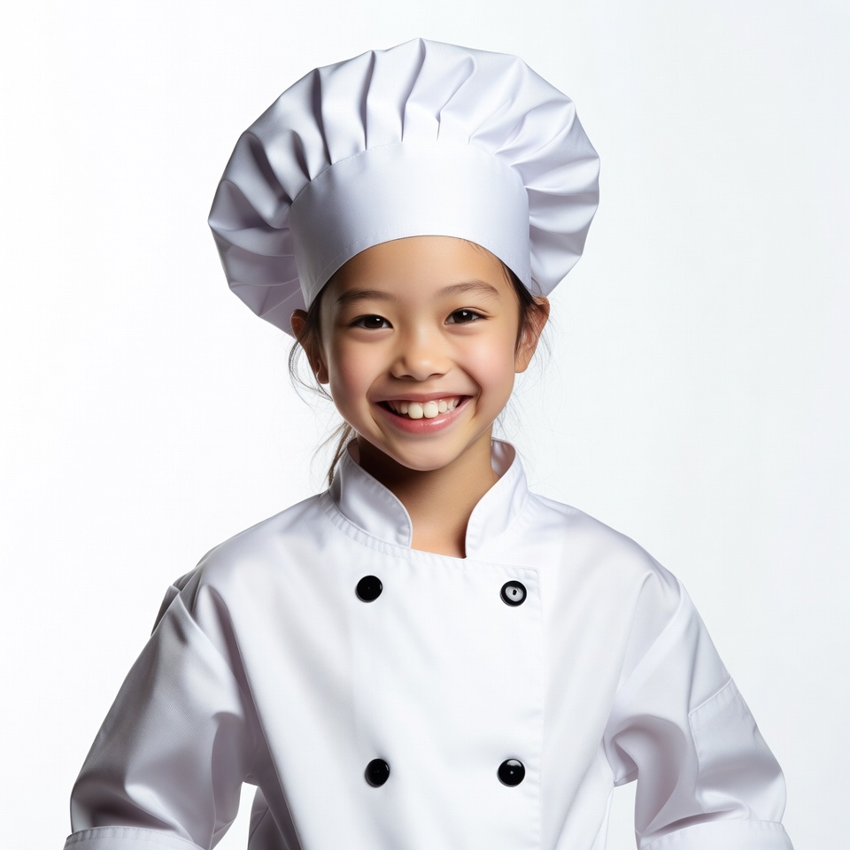 Asian, chef costume, chef hat, chef uniform, child chef, happy face, isolated background, kitchen uniform, ponytail, portrait, smiling girl, white background, white chef outfit, young girl, girl